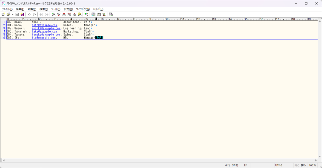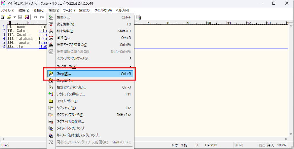 Excelで開くとクラッシュしてしまうようなcsvファイルも、サクラエディタでは問題なく開けることが多いです。