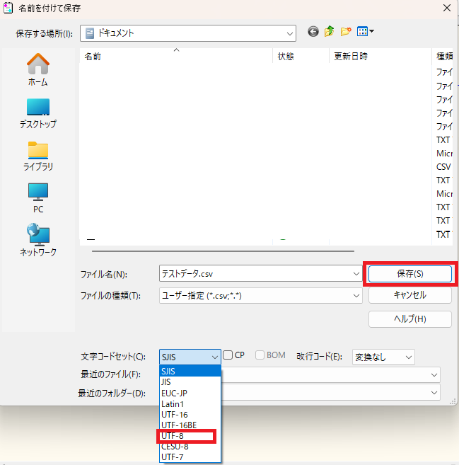 「文字コードセット」で「UTF-8」を選択し、「保存」をクリックする。
