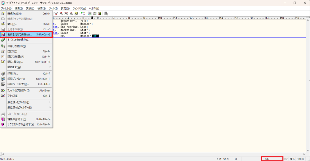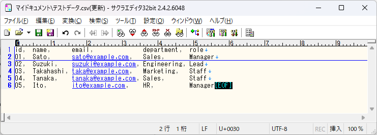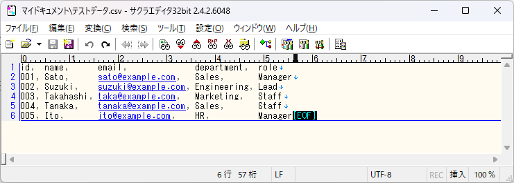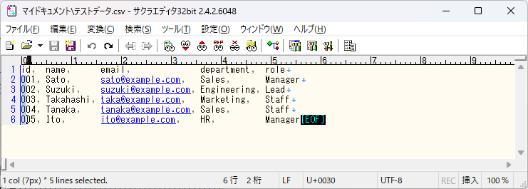 csvファイルを扱う場合、後述しますがExcelで開いてはいけない場合もあり、矩形選択などの機能を利用するためにサクラエディタが便利です。