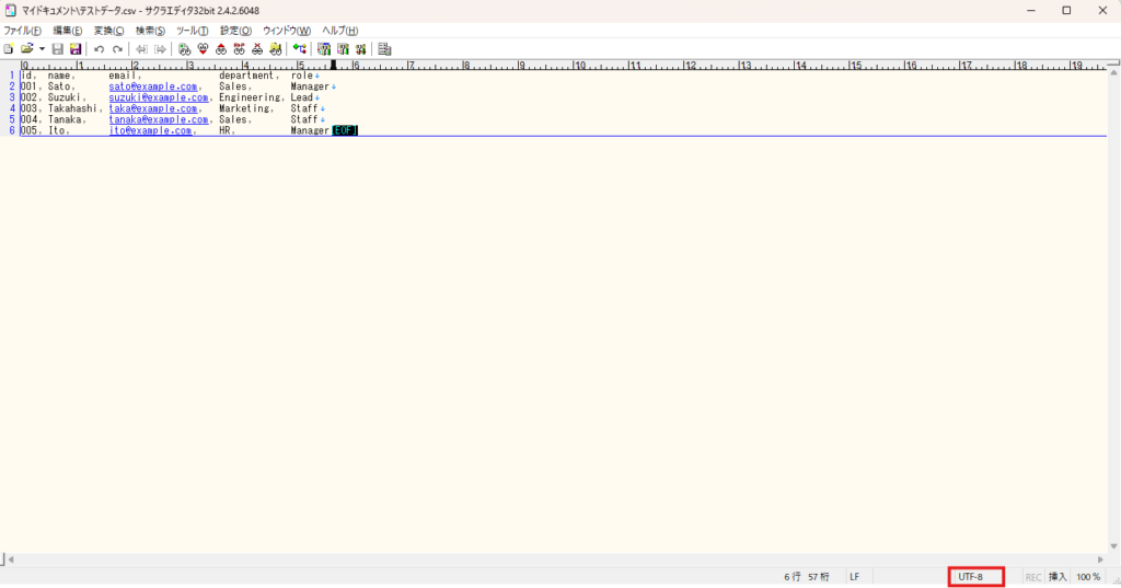 このような事態を避けるために、csvファイルを開く際にはまずはサクラエディタを使用することを推奨します。