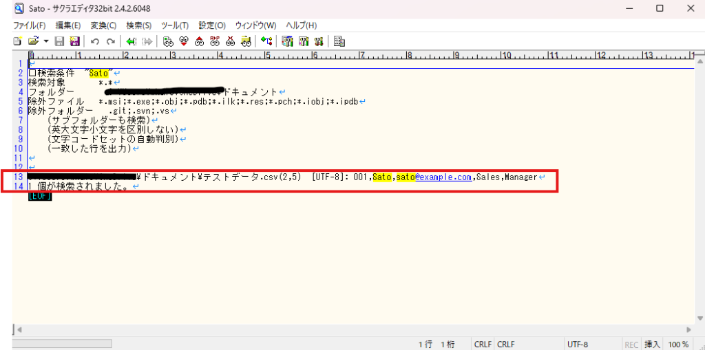 試しに「Sato」という値を含むファイルを検索してみます。