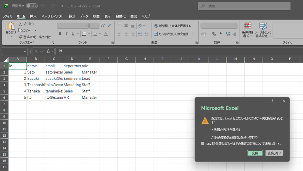 Excel 2016などの古いエクセルでcsvファイルを開くとデータの始めの「0」が消えてしまい、そのまま保存してしまうとデータの不整合が起きてしまいます。